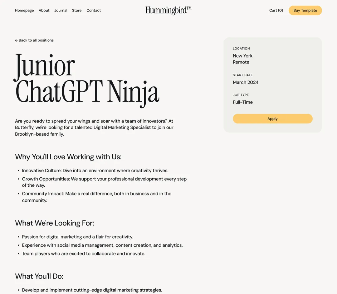 Hummingbird includes a blog and careers collections that are made on the powerful Webflow CMS. This will let you add new content extremely easily.